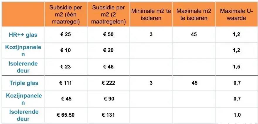 In het overzicht hieronder staat exacte hoeveel subsidie u kunt krijgen voor bepaalde type glas, panelen en deuren. Voor HR++ is die 25 euro per vierkante meter en bij triple glas is dit 111 euro per vierkante meter. Belangrijk om te weten is dat dit het bedrag is voor één maatregel. Dit bedrag verdubbelt wanneer u nog een andere isolatiemaatregel neemt of warmtepomp laat plaatsen.
