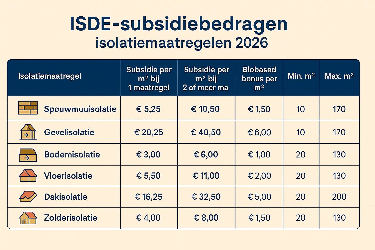 Hieronder allereerst het complete overzicht van de bedragen per vierkante meter, minimum- en maximumgrenzen en de eisen aan de isolatiekwaliteit. Voor bedragen voor glas, bekijk ons blog over de glassubsidie in 2026.